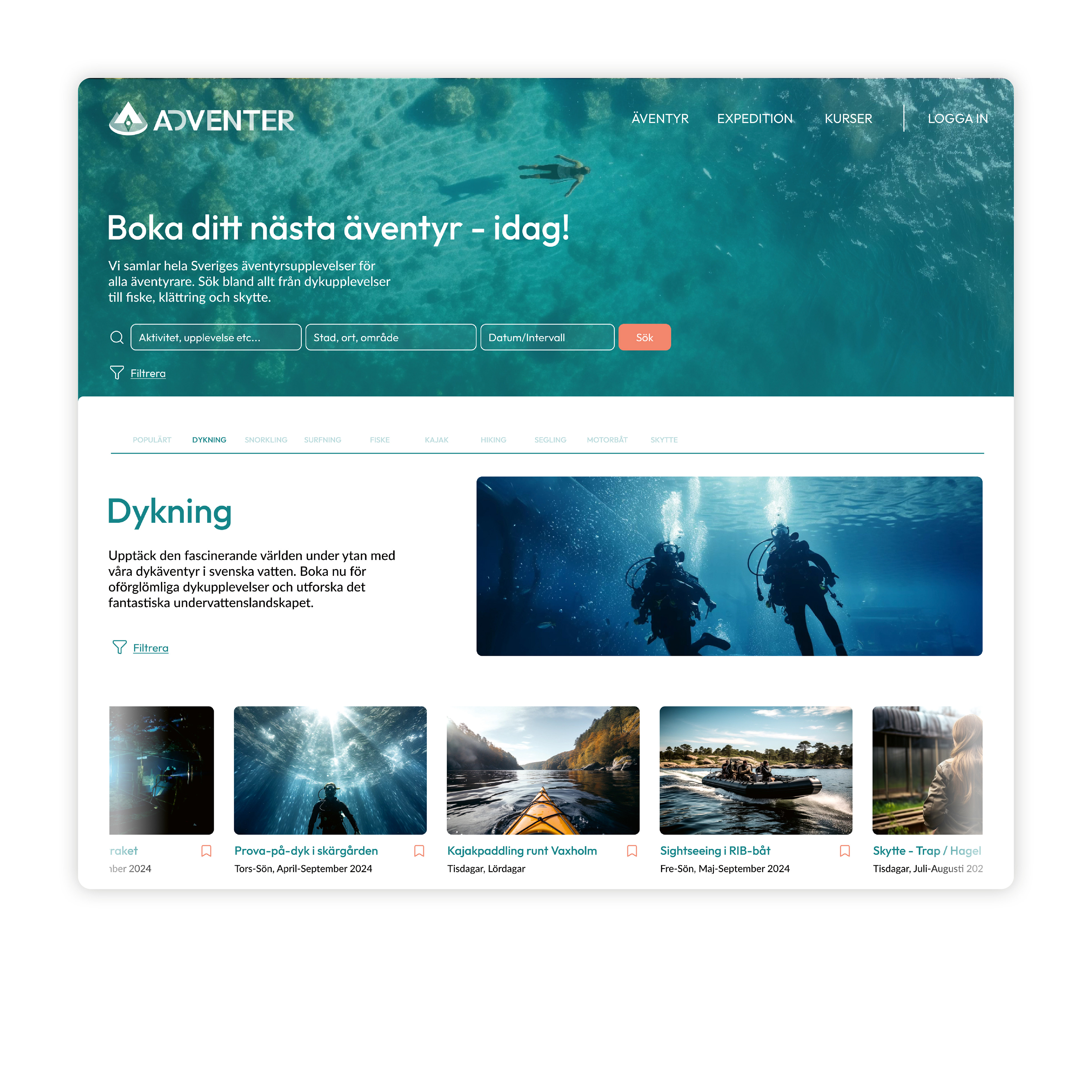För ADVENTER, en ny äventyrsplattform skapad av Plingot, Function of Tech och Dykarna.se, utvecklades ett heltäckande designsystem med logotyp, typografi och webbprototyper.