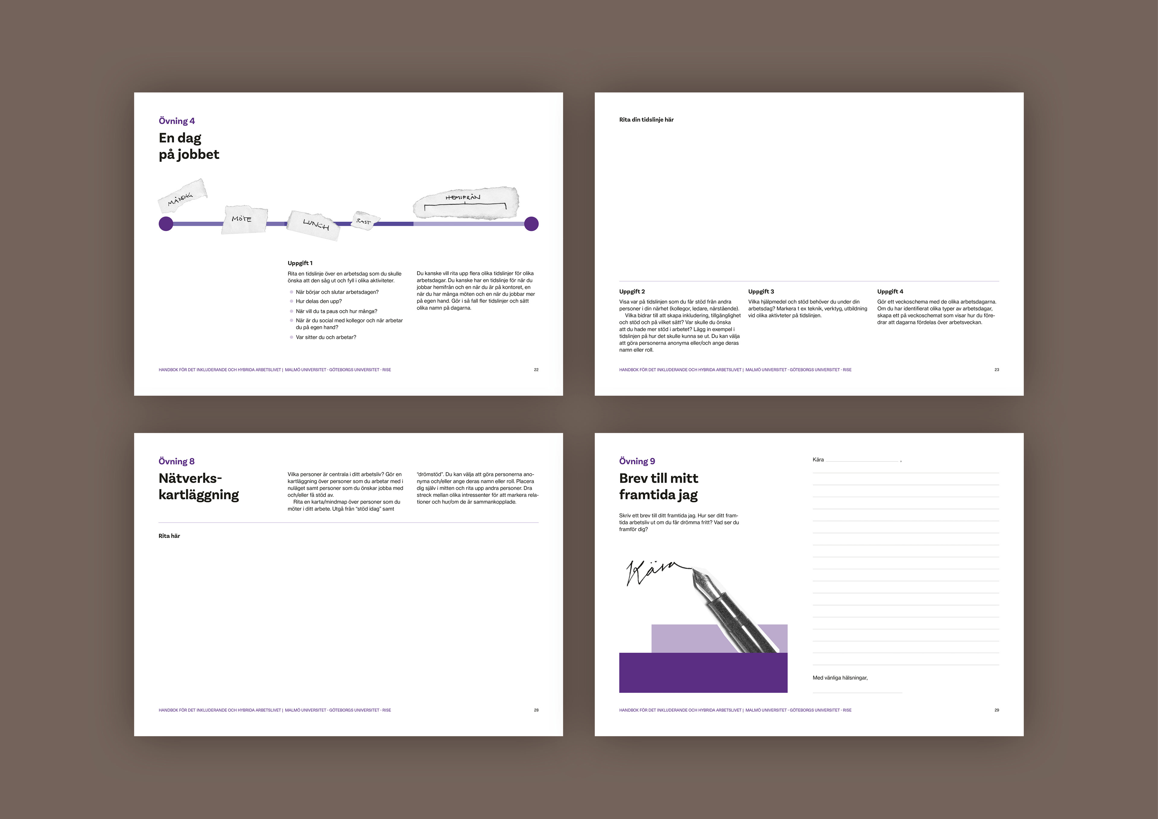 På uppdrag av Malmö och Göteborgs universitet, RISE och FORTE fick jag formge Handbok för det inkluderande och hybrida arbetslivet – ett material som ger verktyg till hur digitalisering och hybridarbete kan bli mer inkluderande, särskilt ur ett funktionsrättsperspektiv.